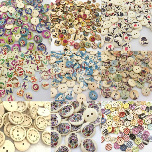 50pcs Printed Round Wooden Buttons 2 Holes 15mm Mixed Wood Clothing