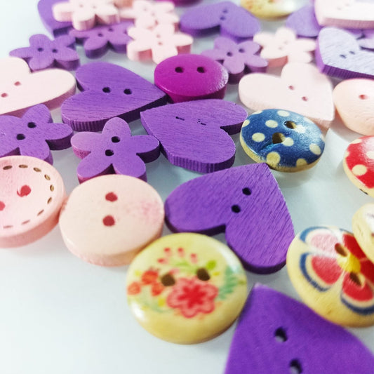 50pcs 10-25mm Flower Heart Shape Wooden Buttons Crafts 2 Hole Sewing Purple Pink