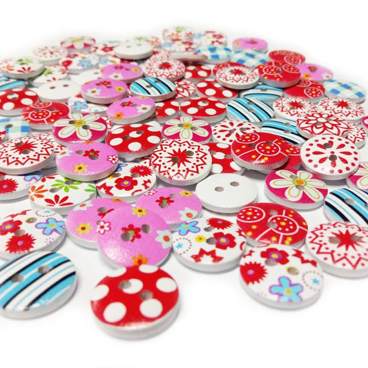 100pcs White Backed Wooden Round Buttons Colourful Mixed Floral Patterns 15mm 2-Hole Pink Red