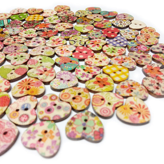 100pcs Wooden Heart Shaped Buttons Mixed Flower Patterns Colourful 17mmx15mm 2-Hole