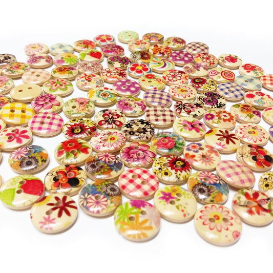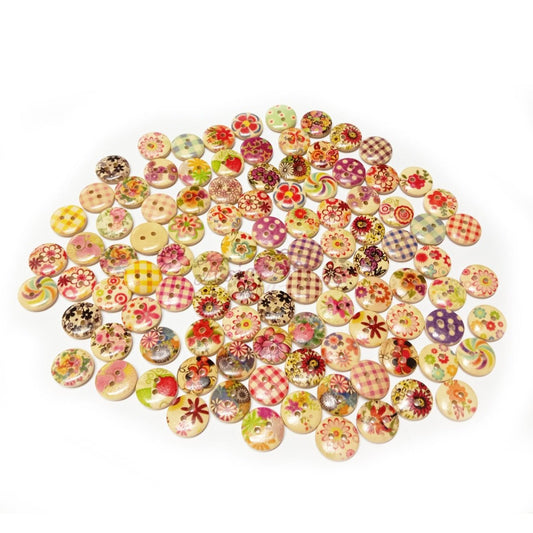 100pcs Wooden Round Buttons Mixed Flower Patterns Colourful 15mm 2-Hole