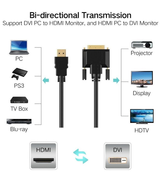 HDMI to DVI Cable 24+1 Pin Adaptor 4K Bi-Directional Male to HDMI Male Converter