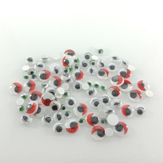 Joggle eyes, or googly eyes have a moving pupil inside of a clear covering dome so that the eyes rattle and move around.