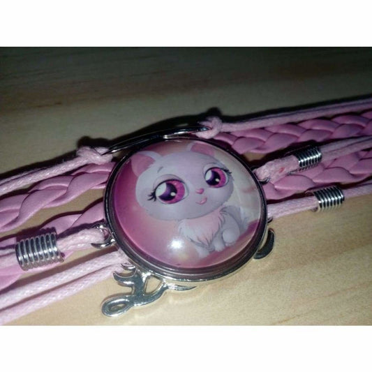 Pink Cat Leather Cuff Bracelet Armband Girls Handmade Rope Wrap Bangles Arm Band
