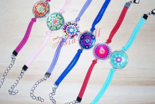 Glass Cabochon Leather Bracelet Love Bangle Infinity India Mandala Flower Pink