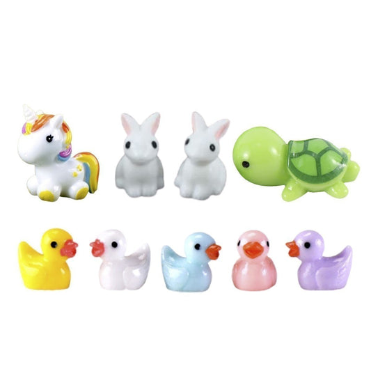 This collection contains a selection of figurines ranging in size from average size 0.5cm to 7cm, consisting of miniature animals, objects and structures. The animals consist of ducks, pigs, cows, rabbits, frogs, turtles, dogs, snails, chickens, echidna, birds, mushrooms and let's not forget unicorns! Glow in the dark ducks are a great adornment. The objects consist of tea sets, houses, towers, lakes, ponds, waterfalls and fish tank pirate shipwrecks.