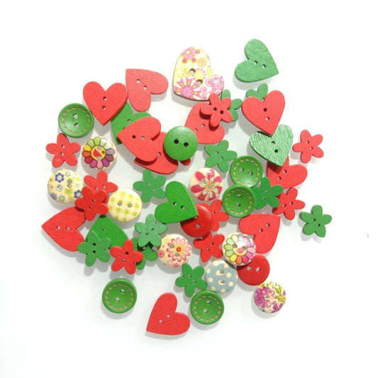 50pcs 10-20mm Colourful Red Green Flower Heart Wooden Buttons Christmas Theme 2 Hole Sewing Scrapbooking Craft DIY